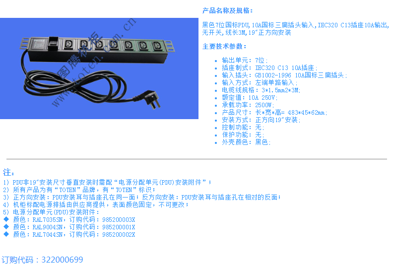黑色7位国标PDU,10A国标三扁插头输入,IEC320 C13插座10A输出,无开关,线长3M,19"正方向安装