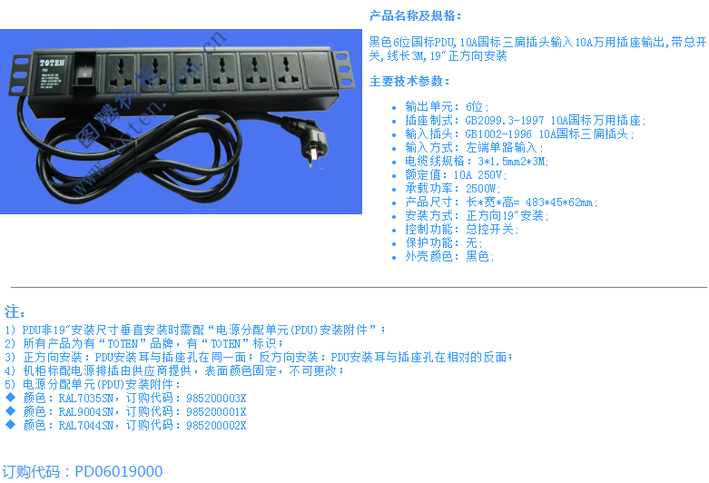 黑色6位国标PDU,10A国标三扁插头输入10A万用插座输出,带总开关,线长3M,19"正方向安装