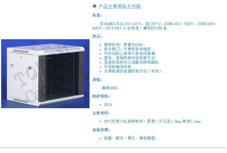 框架结构,承重达60KG; 快开侧门,方便安装和维修; 可关闭的上部和下部走线通道; 壁挂、落地两种可选安装方式; 落地安装时可以选配支脚或脚轮; 可选装轴流风机; 方便快速的挂墙安装方式(专利).